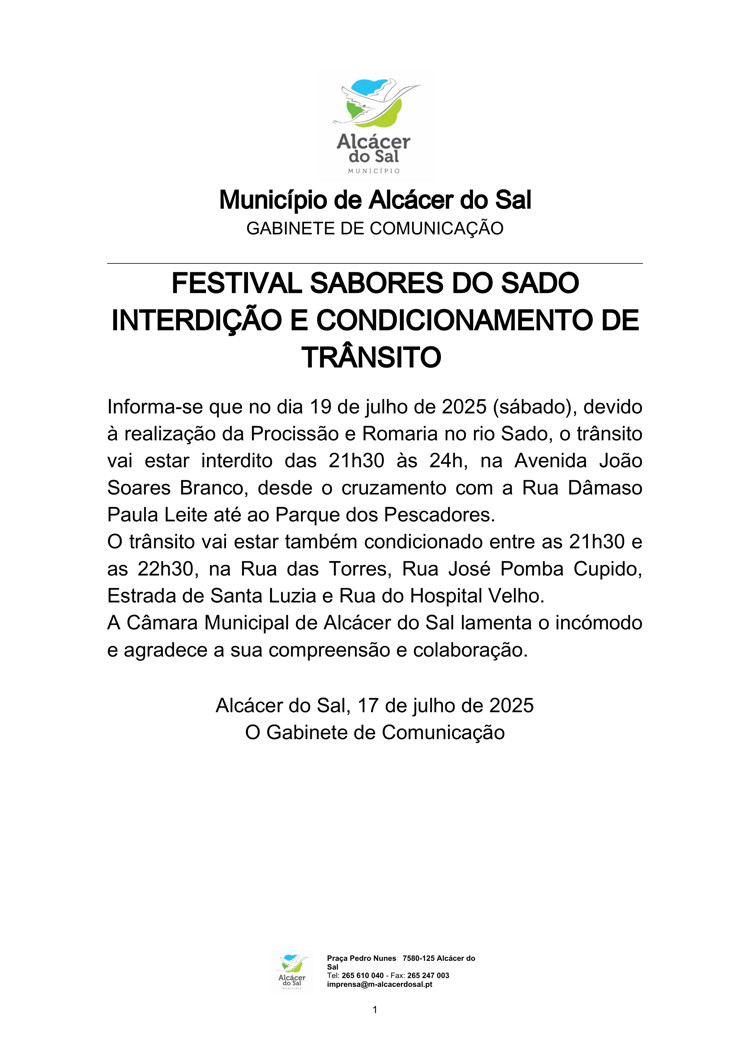Informa-se que no dia 19 de julho de 2025 (sábado), devido à realização da Procissão e Romaria no rio Sado, o trânsito vai estar interdito das 21h30 às 24h, na Avenida João Soares Branco, desde o cruzamento com a Rua Dâmaso Paula Leite até ao Parque dos Pescadores.